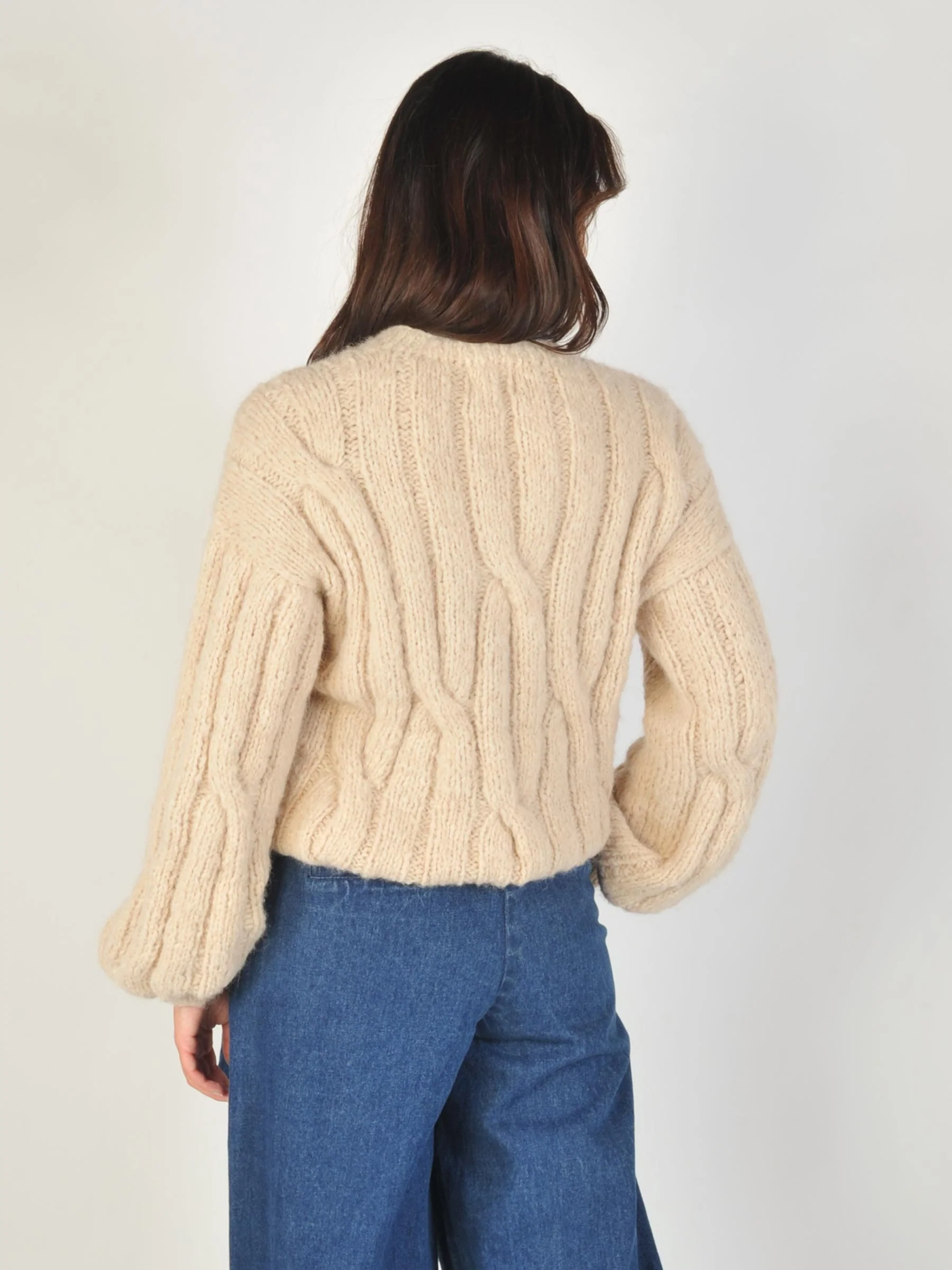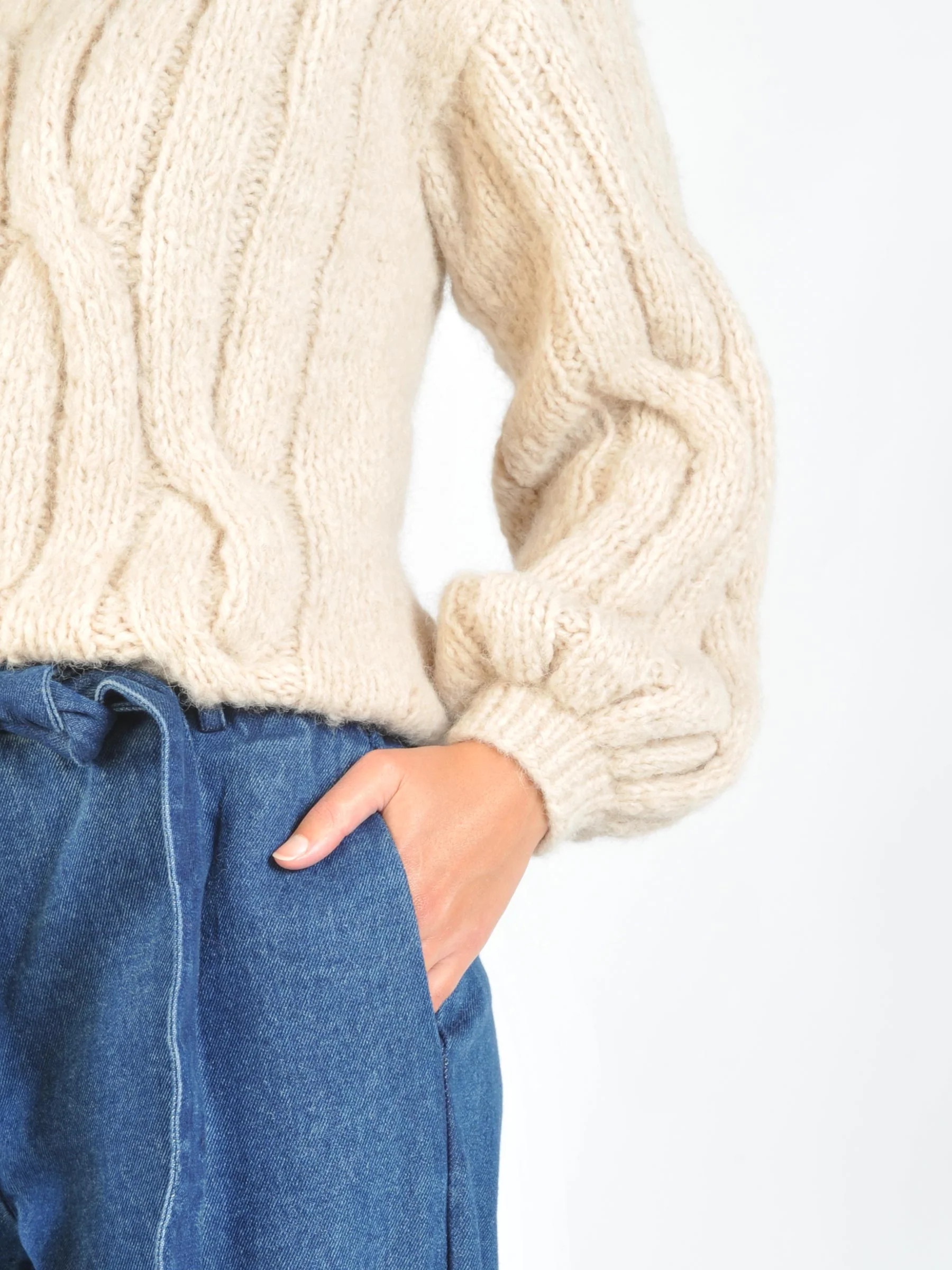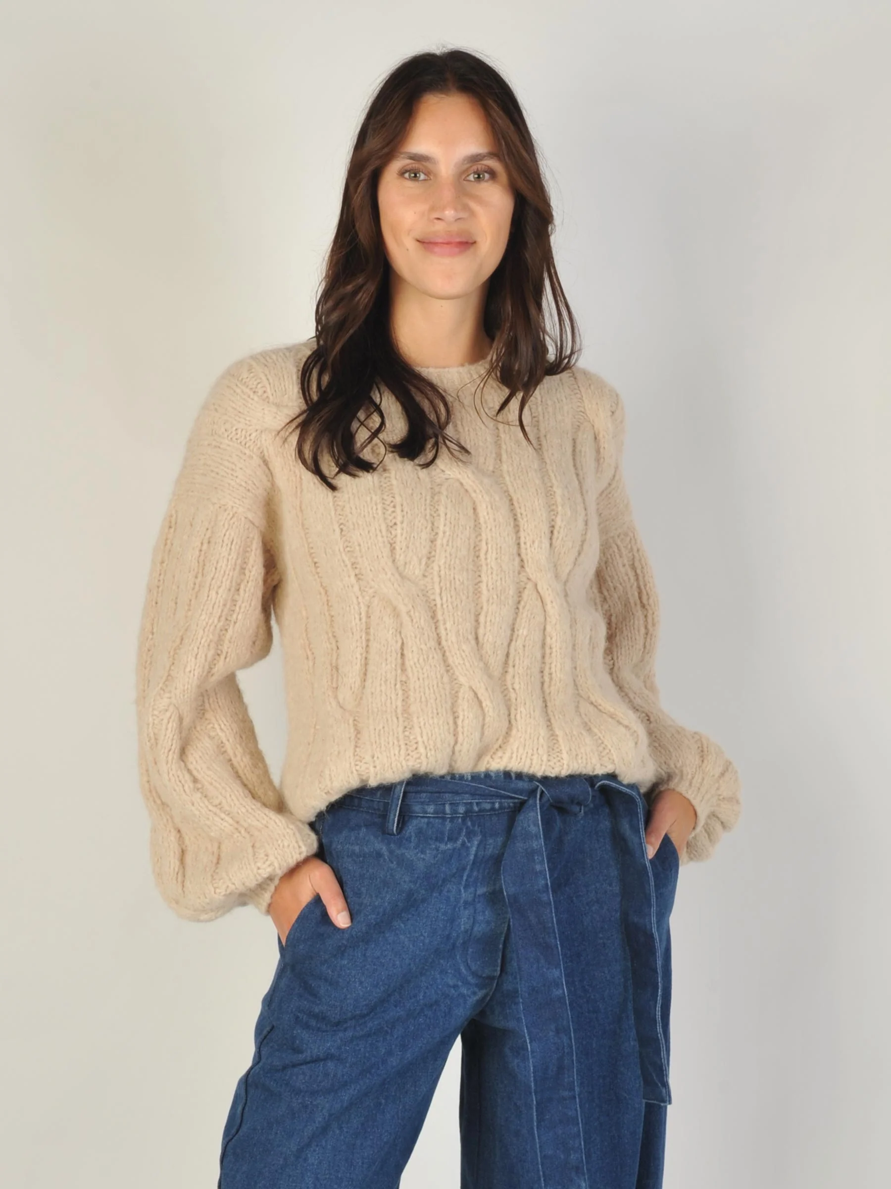 Deze beige kabelgebreide trui van Inti combineert een stoer kabelpatroon met de zachtheid van alpaca. De handgemaakte knit voelt heerlijk warm en komt mooi tot zijn recht over een witte blouse of juist casual op je favoriete jeans.