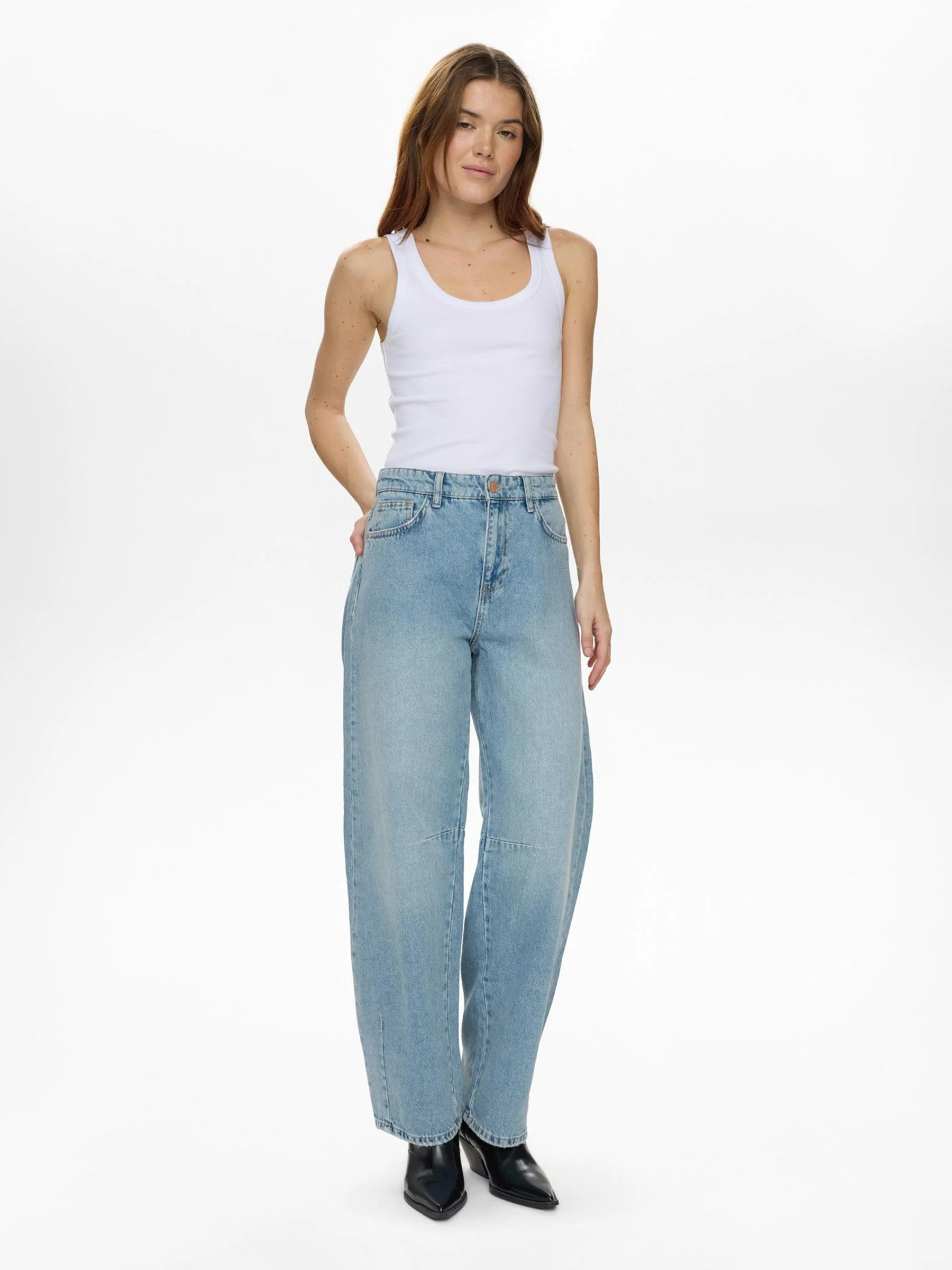Deze lichtblauwe jeans van Nümph heeft een barrel fit die los valt bij de benen en subtiel rond loopt richting de enkel. De hoge taille geeft structuur aan je silhouet, terwijl het stevige katoen zorgt dat de vorm mooi blijft, ook na vaak dragen. Dat maakt deze jeans net even anders dan een standaard straight of wide leg, stoer, modern en super makkelijk te stylen.