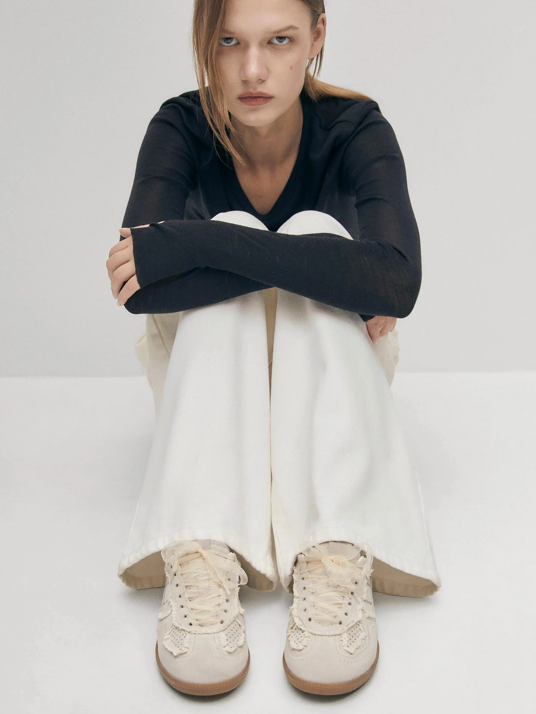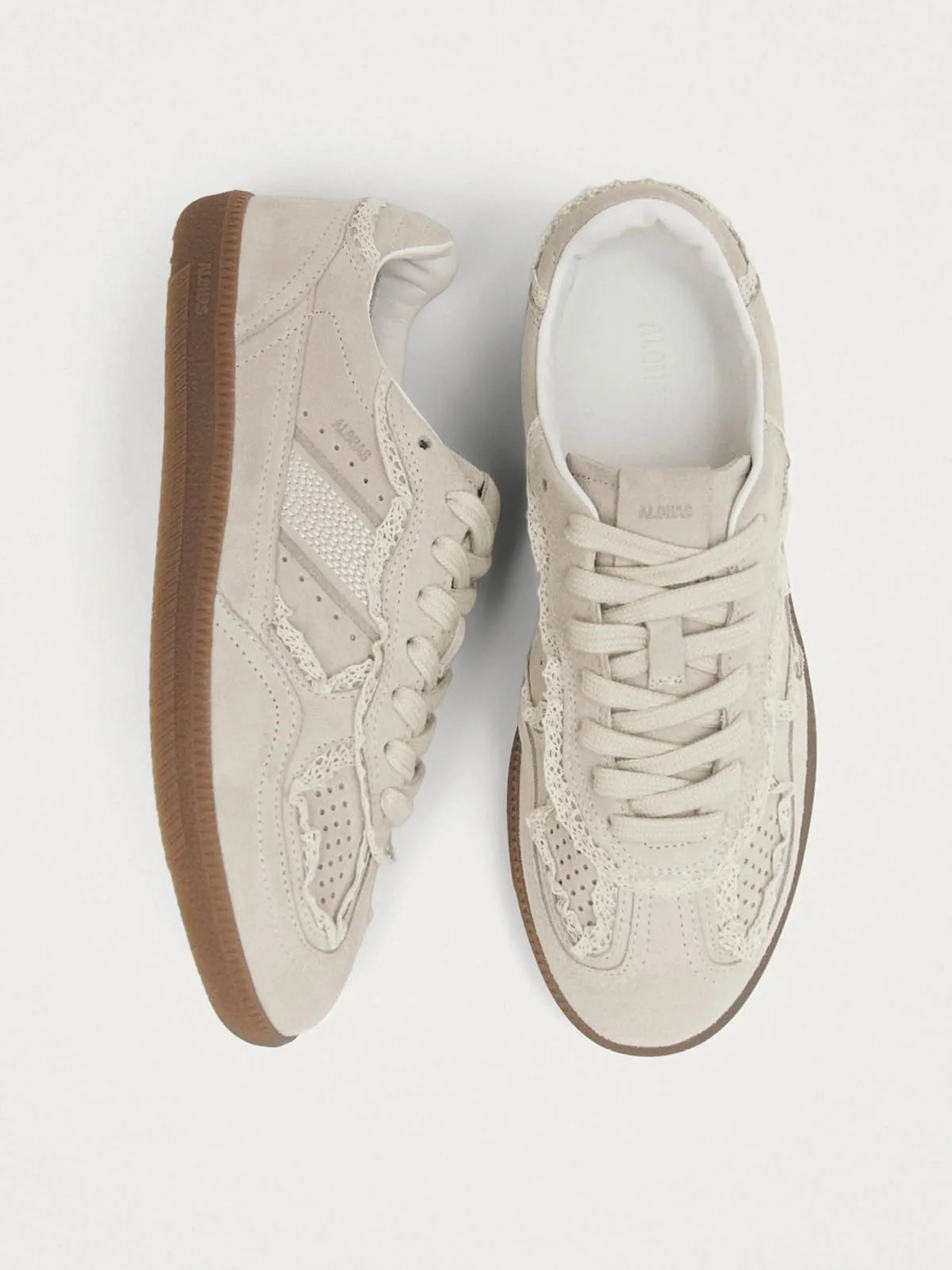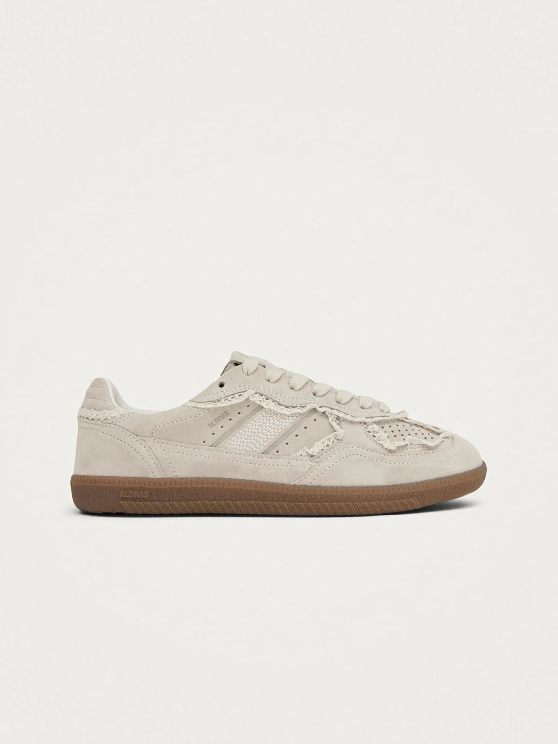 Deze beige leren sneaker van Alohas combineert een sportieve look met een subtiel romantisch detail. De kanten afwerking langs de panelen geeft een elegante twist, terwijl de bruine zool en zachte tint het design in balans houden. Perfect bij een jeans, linnen broek of rok.