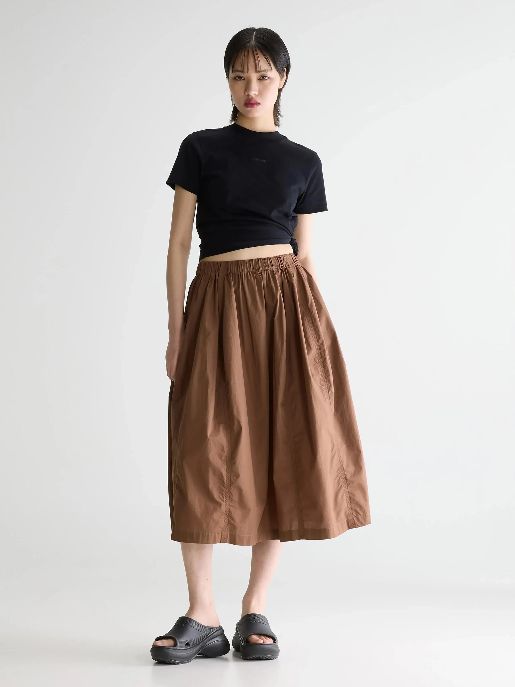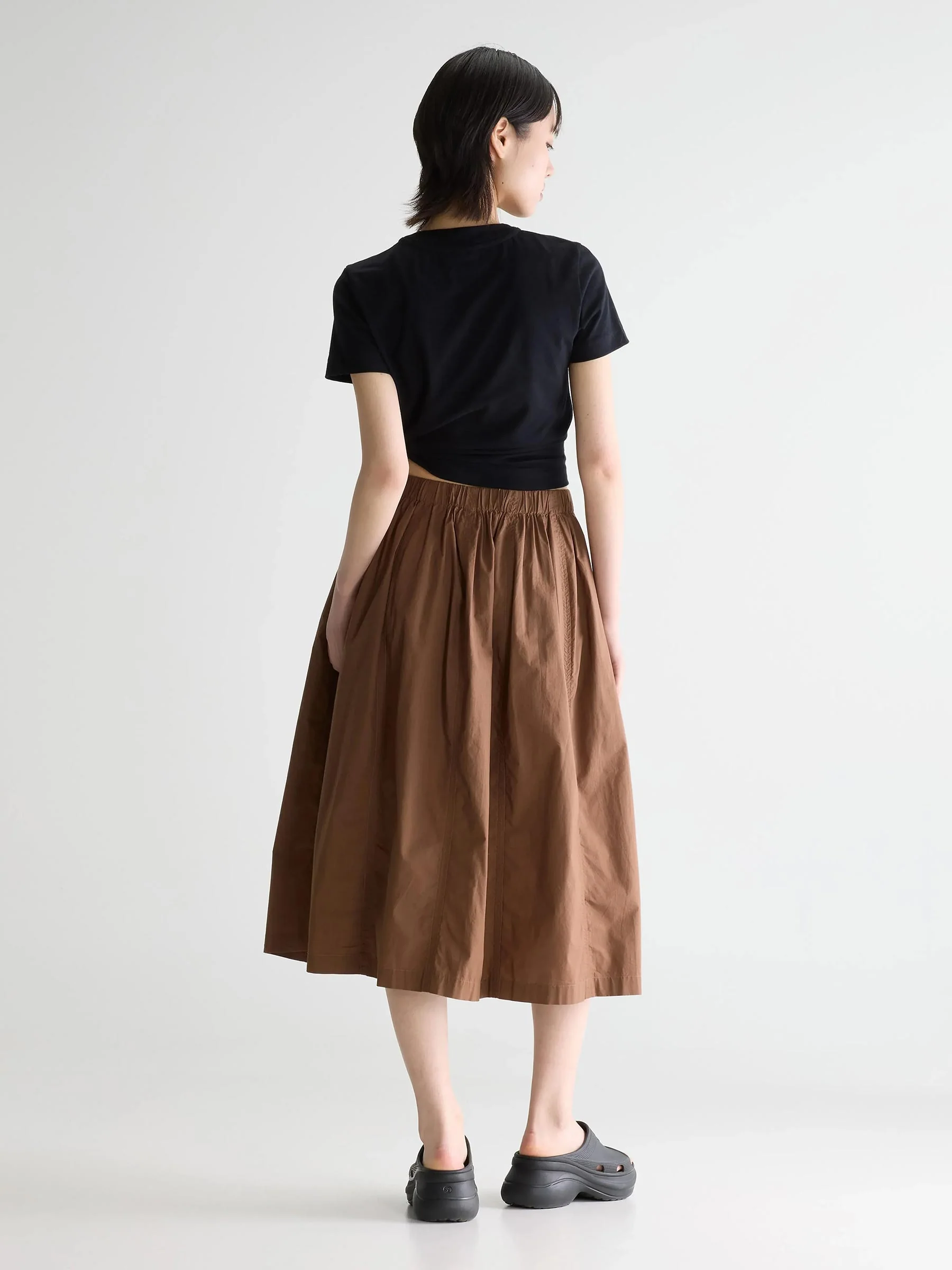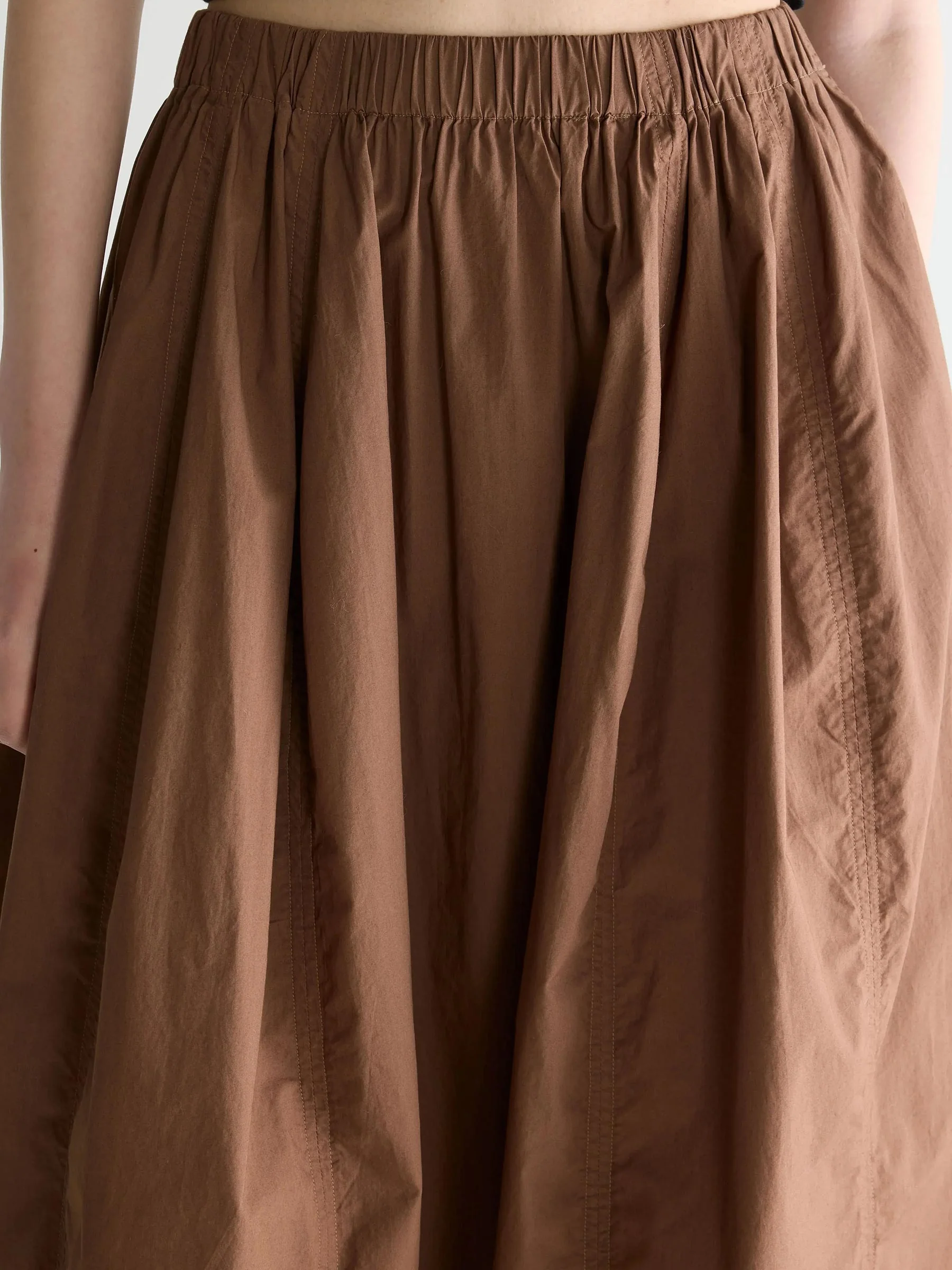 Deze bruine midi rok van Bellerose is zo’n item dat je eindeloos combineert. De soepelvallende stof en elastische taille zorgen voor een comfortabele fit die tegelijk mooi beweegt tijdens het lopen. Perfect met een simpel T-shirt, knit of blouse.