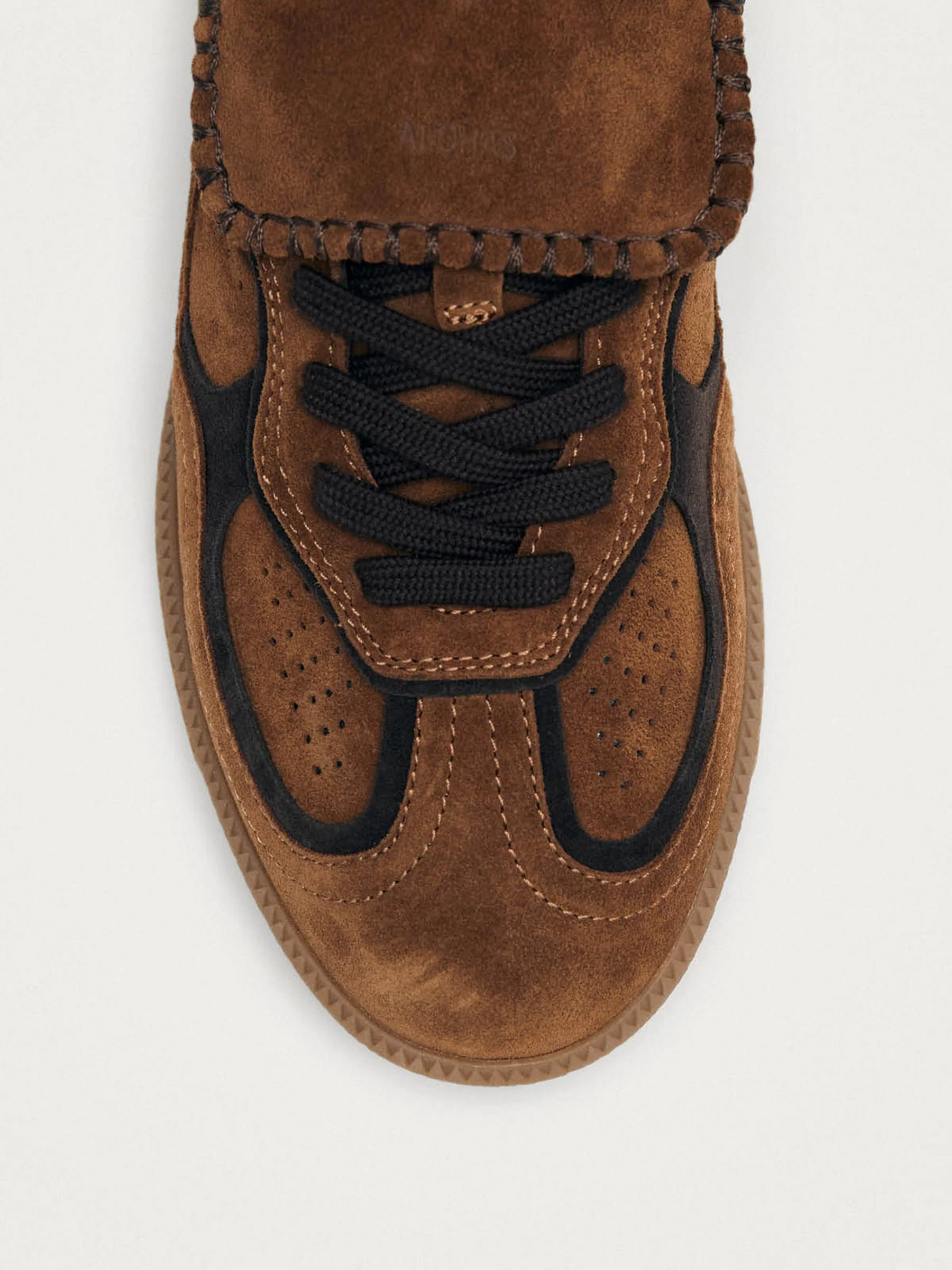 - Bruine suède sneaker met zwarte accenten