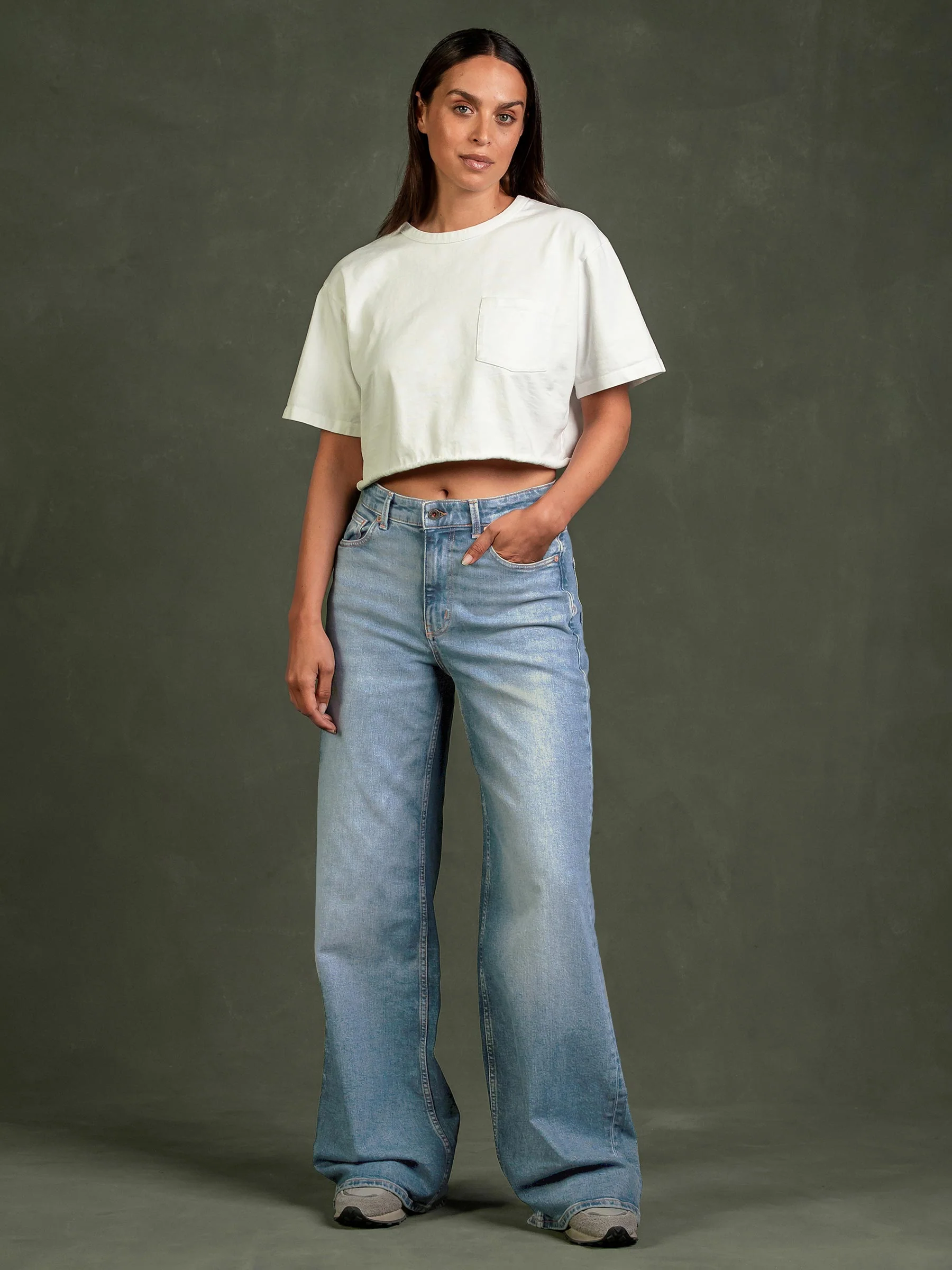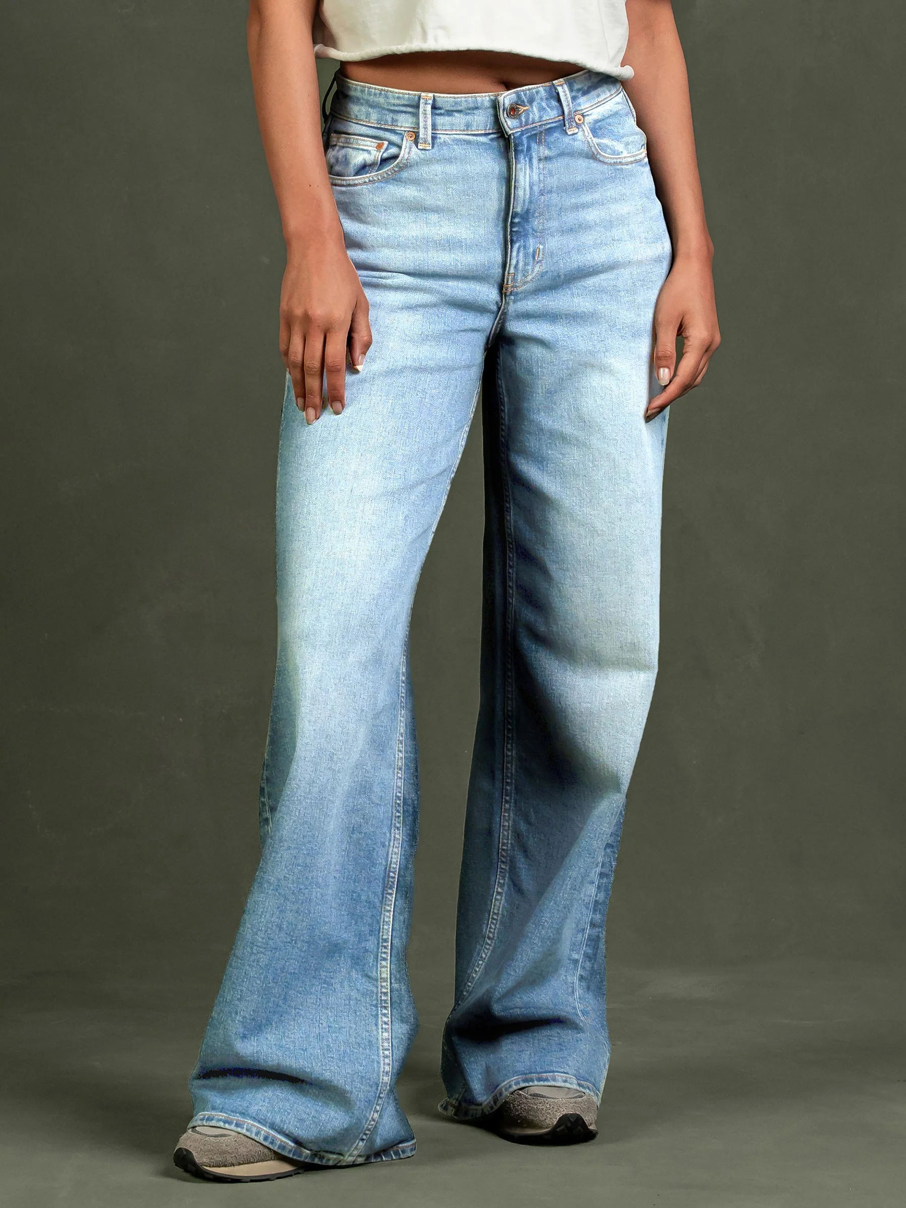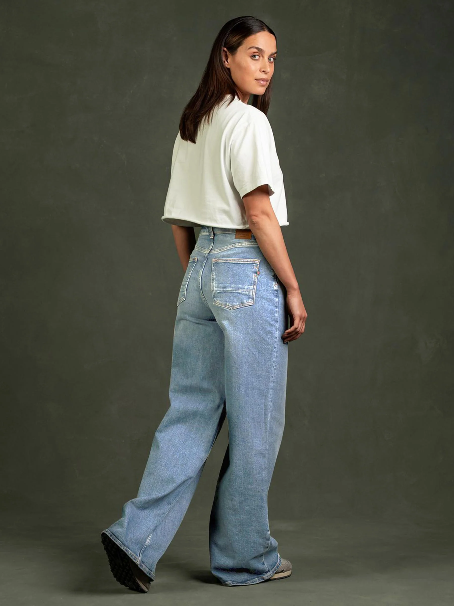 Deze lichtblauwe jeans van Kuyichi is gemaakt van een mix van biologisch katoen en pre consumer gerecycled katoen, afkomstig uit restmaterialen van het productieproces. Het denim is stevig maar zacht en behoudt mooi zijn vorm, met een hoge taille die aansluit en wijde pijpen die soepel naar beneden vallen. Een bewuste keuze dus, die er niet alleen goed uitziet maar ook goed voelt om te dragen.