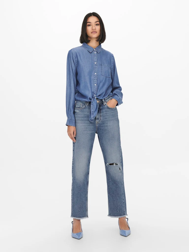 Deze stijlvolle blouse/lange mouwen van Jacqueline de Yong is de perfecte toevoeging aan jouw kledingkast. De blouse is uitgevoerd in een tijdloze blue denim kleur en gemaakt van 100% lyocell. Hierdoor voelt de blouse super zacht en licht aan op de huid. Het materiaal zorgt ook voor een lichte glans, wat zorgt voor een luxe uitstraling. De blouse heeft een kraag, knoopsluiting en borstzakken voor een klassieke touch. Draag de blouse met een stoere spijkerbroek en sneakers voor een casual look, of met een zwarte broek en hakken voor een meer geklede uitstraling. Shop nu deze must-have blouse en geef jouw outfit een fashionable upgrade!