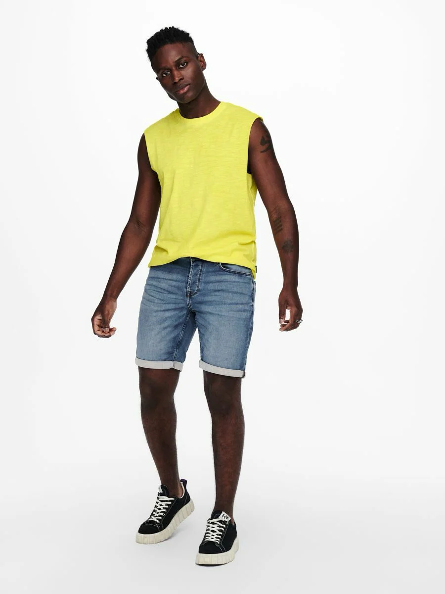 Upgrade je zomergarderobe met deze trendy blue denim heren short van het geliefde merk Only & Sons. De short is gemaakt van hoogwaardig stretchmateriaal en heeft een vaste omslag onderaan de broekspijp voor een coole uitstraling. Het slim fit model zorgt voor een trendy en moderne look. Het ontwerp is voorzien van praktische zakken aan de voor- en achterzijde, perfect om al je essentials in op te bergen. De short is gemaakt van 72% katoen, 26% polyester en 2% elastaan, waardoor het niet alleen comfortabel zit, maar ook nog eens duurzaam is. Combineer deze veelzijdige short met een basic T-shirt en sneakers voor een casual look of draag het met een overhemd en loafers voor een meer geklede uitstraling. Bestel nu deze stijlvolle en veelzijdige Only & Sons denim short bij NummerZestien voor een zomerse outfit waar je gegarandeerd mee opvalt!