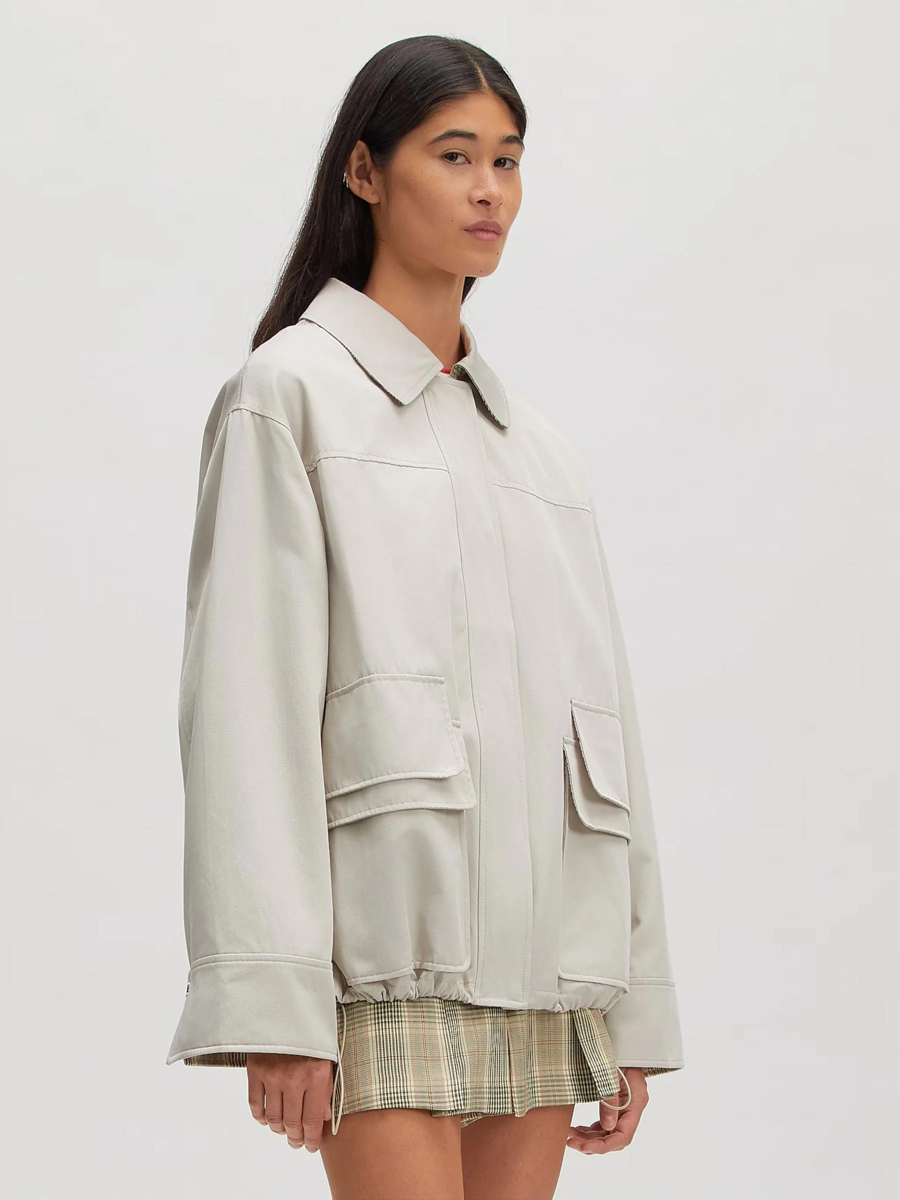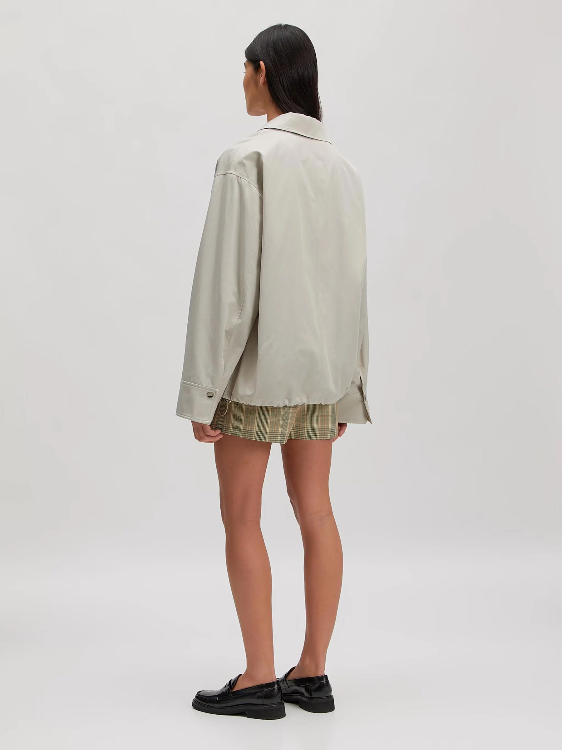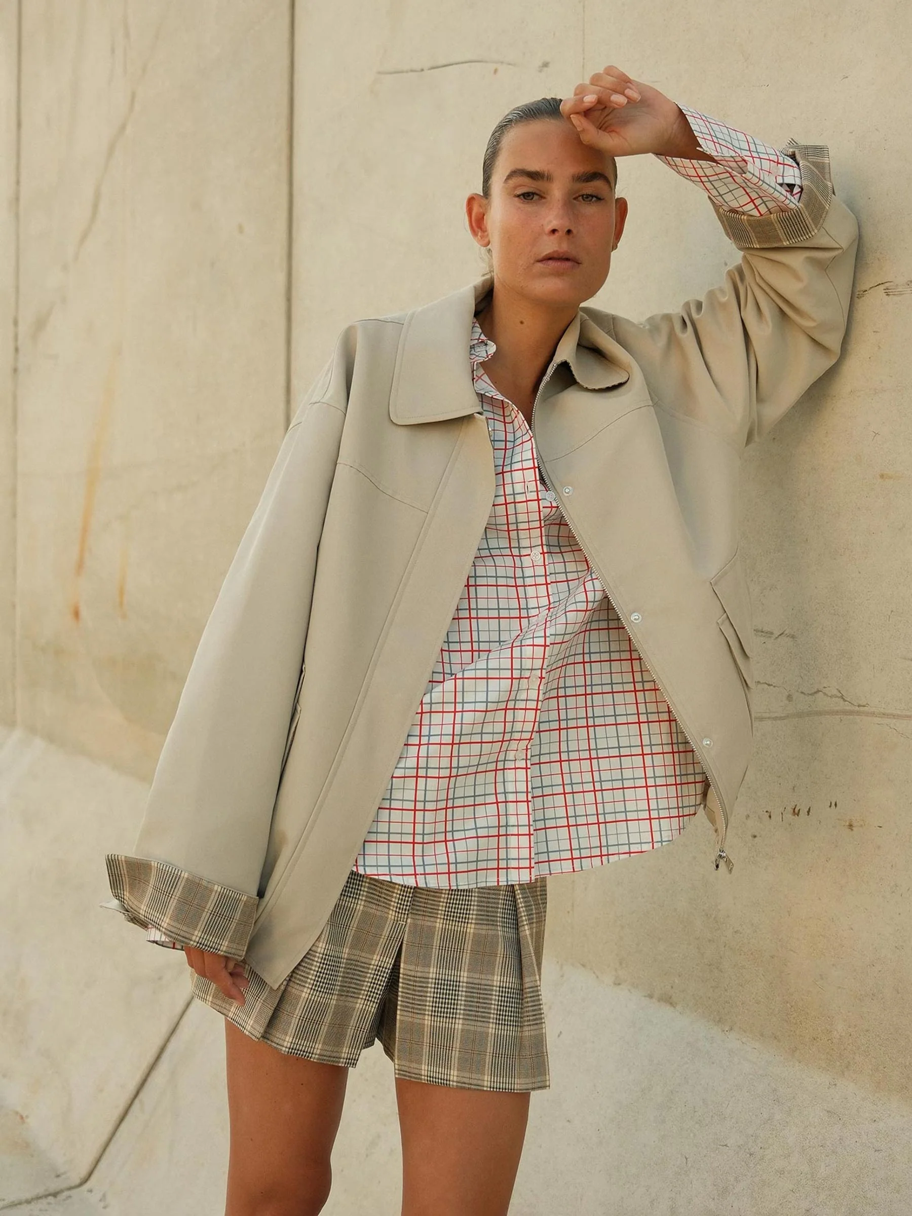 Sla de mouwen om zodat de geruite voering zichtbaar wordt en style met een gestreept shirt, minirok en loafers voor een weekend look. Of draag de jacket dicht over een simpel T-shirt en wijde broek voor een relaxte, alledaagse outfit.