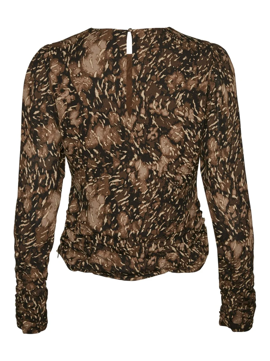 Upgrade je garderobe met deze prachtige top van Vero Moda, verkrijgbaar in een trendy bruin dessin. Perfect voor zowel alledaagse outfits als voor speciale gelegenheden. Deze top is gevoerd en uitgerust met lange mouwen en een elegante ronde hals met keyhole detail aan de achterzijde. De mouwen zijn afgewerkt met smokwerk, wat zorgt voor een speelse touch. De onderzijde van de top is voorzien van geplooide details en heeft een subtiel ritsdetail aan de linkerzijnaad. De allover print maakt deze top extra bijzonder. Gemaakt van duurzaam materiaal, namelijk 68% gerecycled polyester en 32% polyester, en de voering is 100% polyester. Bestel nu en voeg deze must-have top toe aan je collectie!