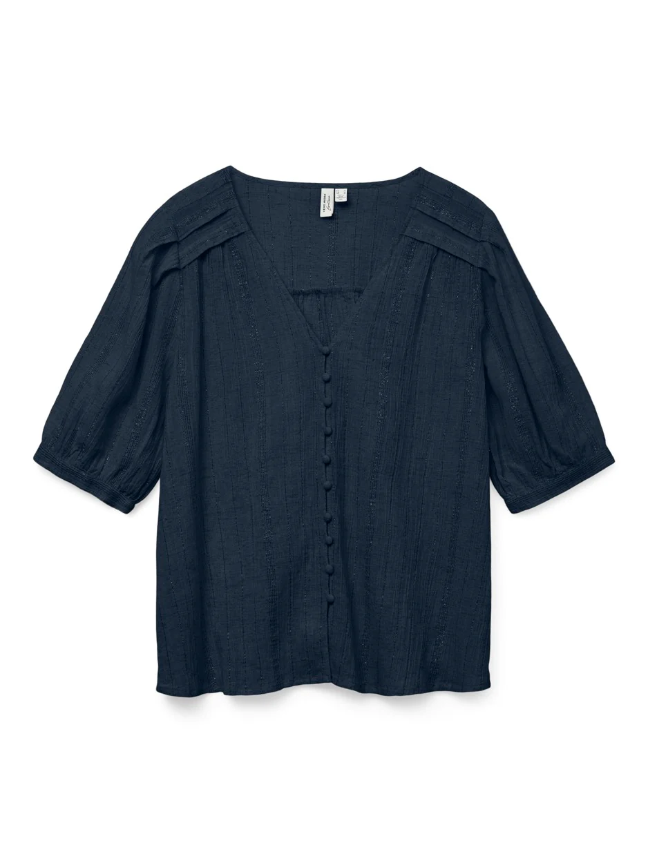 Het perfecte casual t-shirt voor dames in een trendy navy kleur, afkomstig van het populaire merk Vero Moda. Gemaakt van een comfortabele mix van 47% viscose, 36% katoen, 16% linnen en 1% metaalvezels. Dit zorgt voor een zachte en luchtige stof die perfect is voor de warmere maanden. De korte mouwen maken het shirt perfect voor het zomerse weer en de ronde hals geeft een speelse touch aan het geheel. Ideaal te combineren met een jeans en sneakers voor een casual dagelijkse look. Voeg dit navy t-shirt toe aan je collectie en laat je stijl stralen!