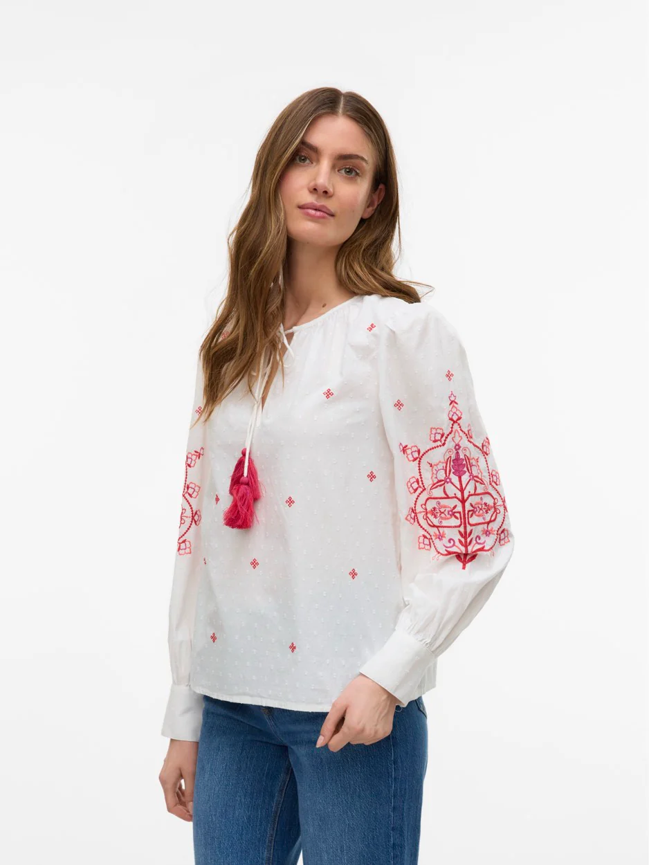 Deze prachtige wit dessin kleurige top van Vero Moda is een absolute must-have voor elke vrouw! De top is gemaakt van 100% katoen en voelt daardoor heerlijk zacht en comfortabel aan op de huid. Maar dat is niet het enige, want katoen staat ook bekend om zijn ademende eigenschappen, waardoor je de hele dag door fris en droog blijft. De top heeft lange mouwen en kan daardoor het hele jaar door gedragen worden. De mooie witte kleur met een subtiel dessin maakt deze top een echte eyecatcher. Perfect te combineren met een jeans en sneakers voor een casual look, of met een rok en hakken voor een meer geklede uitstraling. Met deze top voeg je zeker een trendy en veelzijdig item toe aan je garderobe! Bestel hem vandaag nog bij NummerZestien en geniet van de ultieme mix van comfort en stijl.