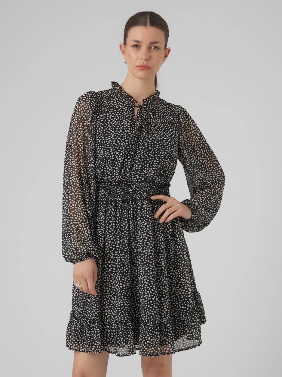 Deze stijlvolle zwarte jurk van het merk Vero Moda is een echte must-have voor elke moderne vrouw. De jurk heeft een opvallend dessin en valt tot net boven de knieën, waardoor het een perfecte keuze is voor zowel formele als informele gelegenheden. De lange mouwen en de prachtige V-hals met striksluiting geven de jurk een vrouwelijke en elegante uitstraling. Bovendien zorgt de brede elastieke band in de taille voor een flatterende pasvorm.