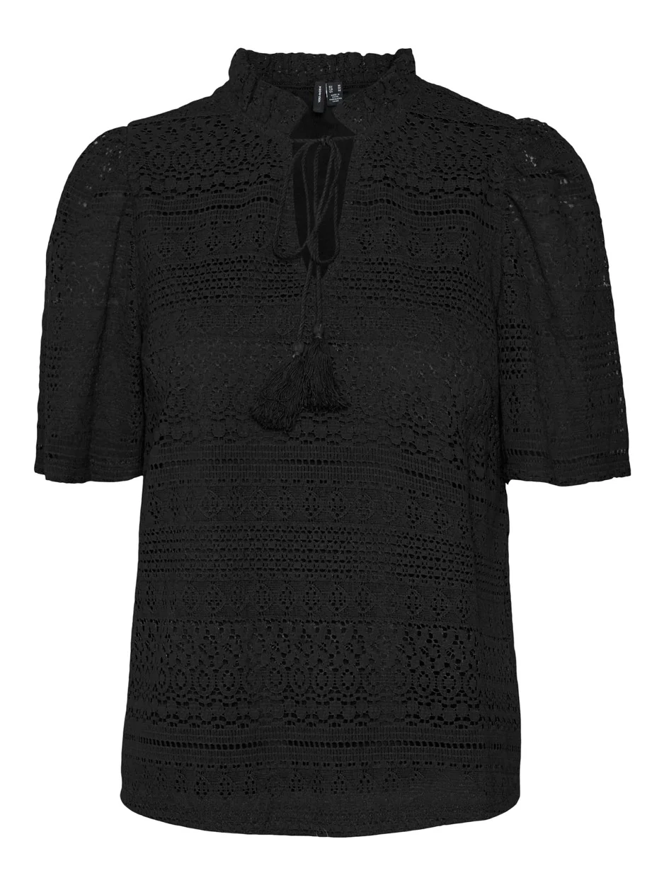 Deze zwarte top voor dames van het populaire merk Vero Moda is een echte aanwinst voor je garderobe. Gemaakt van 75% katoen en 25% polyamide of nylon, is deze top niet alleen trendy, maar ook comfortabel om te dragen. De top heeft een klassieke ronde hals en valt tot net boven de heupen. Hierdoor is het perfect te combineren met een jeans, rok of pantalon. De korte mouwen maken het een ideale top voor het voor- en najaar. Bestel deze must-have top nu bij nummerzestien en geniet van een stijlvolle en veelzijdige toevoeging aan je kledingkast.
