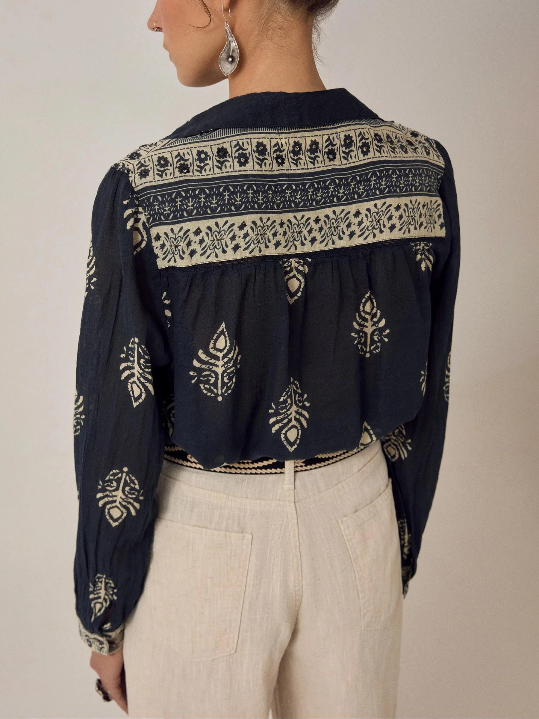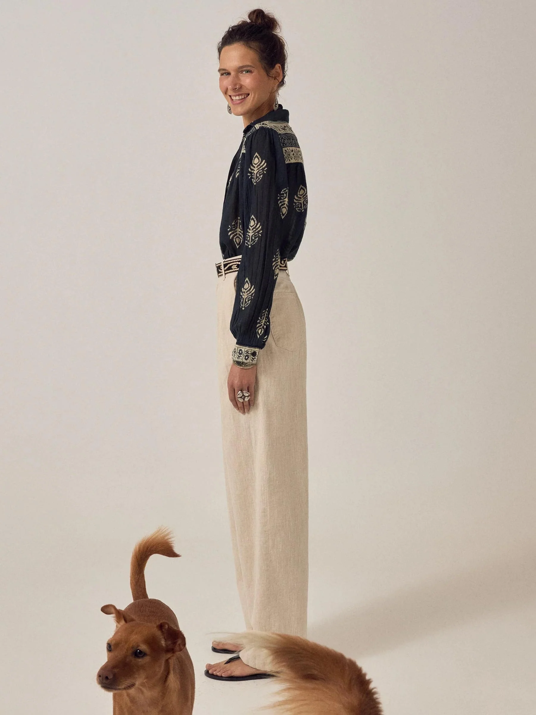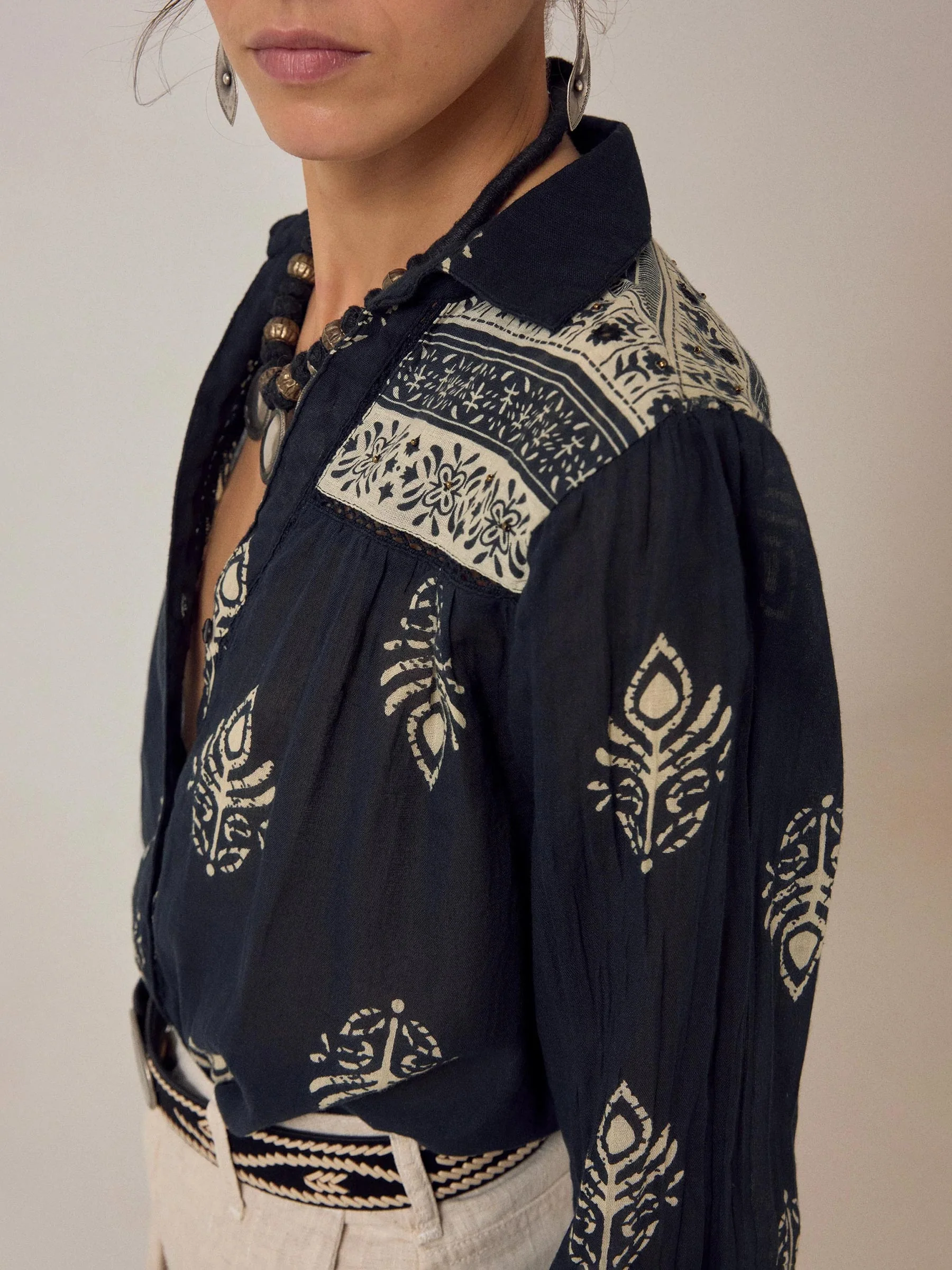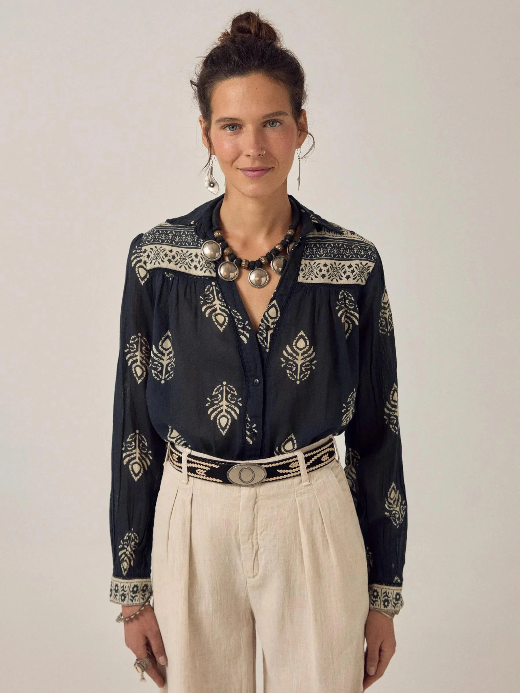 De zwarte Rani blouse van Maison Hotel heeft een print die je meteen blijft kijken: organische bladvormige motieven met een henna-gevoel, handgetekend en nooit saai herhalend. De lichte katoenen stof valt soepel op het lijf, terwijl de boorden en manchetten met smalle sierrandjes het geheel net wat extra diepte geven. Maison Hotel werkt met ambachtslieden die elke print met de hand vervaardigen, wat ieder stuk uniek maakt.