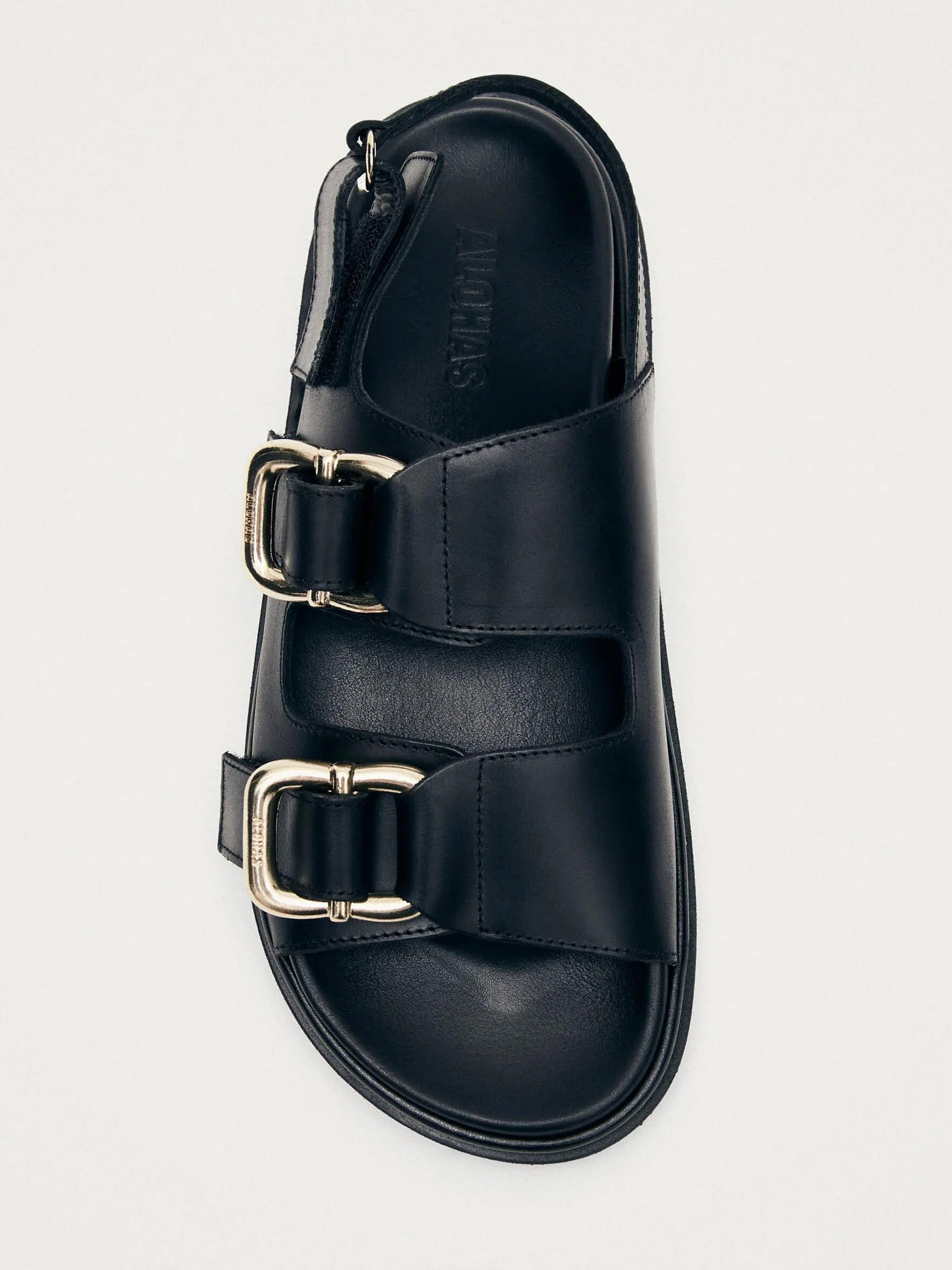 Een sandaal die je van het strand tot een terrasje draagt zonder erbij na te denken: dat is de zwarte Harper van Alohas. Twee brede banden met opvallende goudkleurige gespen, een gevormd voetbed en een dikke gestapelde tussenzool geven je net dat beetje extra hoogte én de hele dag comfort.